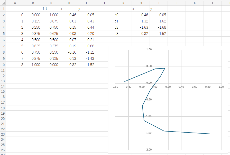 について \(t\) の 0~1の範囲の1/8刻みの値について \(\boldsymbol{C}\) の \(x, y\) を求めればいいので、まずB, C列に \(t\) と \(1-t\) の値を入れ、