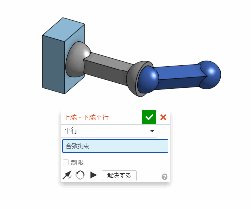 平行合致を使うと、パーツの面に平行の条件をつけられる。