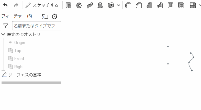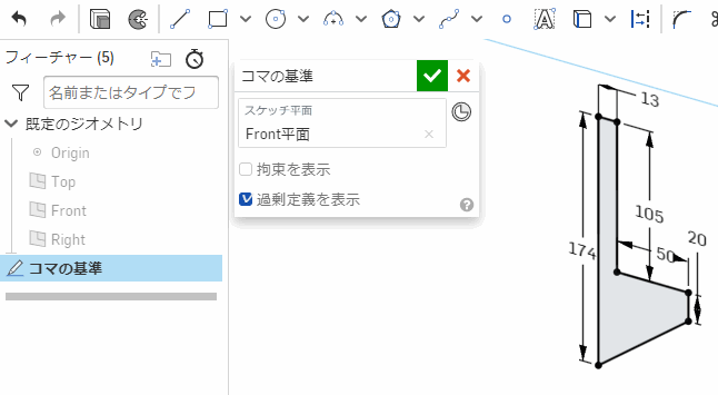だけはどちらの場合にも表示される。スケッチ中にれらのアイコンをクリックすると、スケッチは強制的に終了してパーツを作る状態になる。