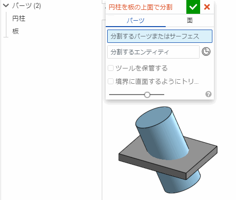 では、パーツやサーフェス同士が交差しているときに、一方でもう一方を分割できる。