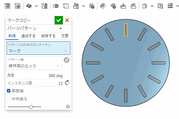 の右の ∨ から選択) では、図のように「パターンのためのエンティティ」(コピーされるもの) と「パターン軸」(並べる方向の基準) を選んで実行すると、選んだものが等間隔に並んでコピーされる。
