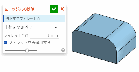 設定を「フィレットの削除」にするとその面 (エッジ) のフィレットがなくなる。