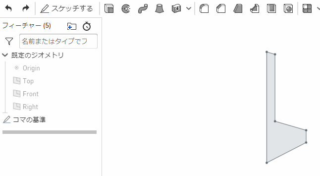回転でパーツを作るには、もとのスケッチは閉じた形 (中が灰色で表示される) でなければならない。