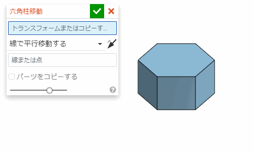 「線で平行移動する」の設定では、線を選ぶとその方向に線の長さ分だけパーツが移動する。また、点を2つ選んでも同様に移動する。