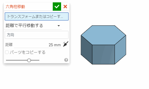「距離で平行移動する」の設定では、選んだ線の方向に、指定した距離だけパーツが移動する。