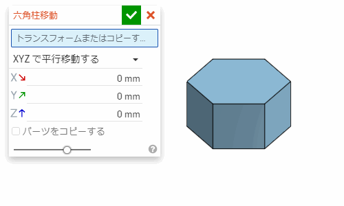 「XYZで平行移動する」の設定では、X, Y, Z方向に、それぞれ指定した分だけパーツが移動する。