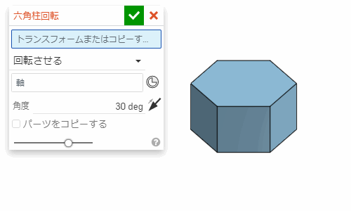 「回転させる」の設定では、選んだ軸の周りに、指定した角度だけパーツが回転する。
