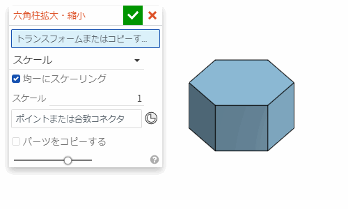 「スケール」の設定では、選んだ点を基準にして、指定した倍率でパーツを拡大・縮小する。