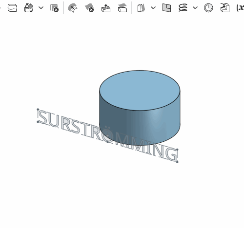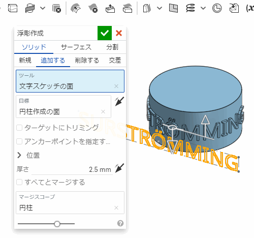 の右の ∨ から選択) では、円柱から離れた位置にあるスケッチを側面に巻き付けるようにして浮彫のような形をつくることができる。
