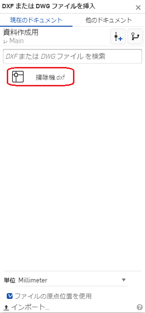 をクリックし、メニューの「インポート」をクリックしてそのファイルを選べば、リストにその図面が追加される(右図)。その項目をクリックすると