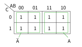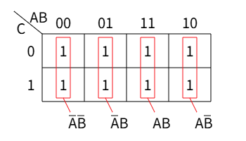 3変数の場合は、このような隣り合った4つのマスにすべて 1 が入っていれば、それが1つの入力かその否定 (バーをつけたもの) になります。