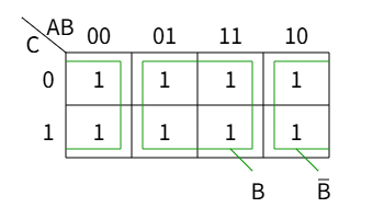 このとき、2つあわせたものが意味するものを考えると「\(B\) が 1 で、\(A\) は 0, 1 の両方 → \(A\) については条件なし」なので、2つ合わせて \(B\) となります。