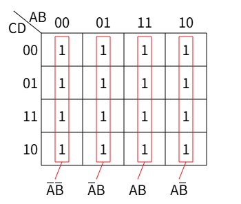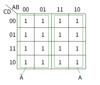 4変数の場合は、このような隣り合った8つのマスにすべて 1 が入っていれば、それが1つの入力かその否定 (バーをつけたもの) になります。