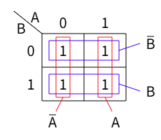 このとき、2つあわせたものが意味するものを考えると「\(B\) が 1 で、\(A\) は 0, 1 の両方 → \(A\) については条件なし」なので、2つ合わせて \(B\) となります。