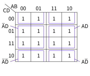 入力が \(A, B, C, D\) の4つの場合のカルノー図はこのようになります。