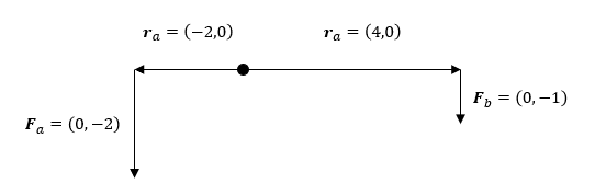 \(\boldsymbol{r}_a=(-1, 2)\), \(\boldsymbol{F}_a=(0, -1)\)