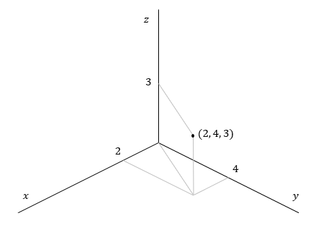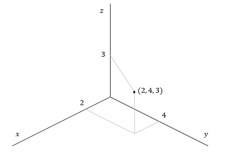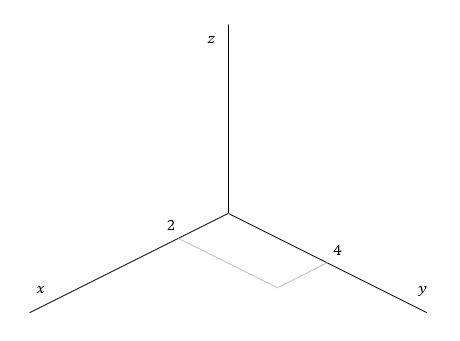 例えば xy平面上の点 (2, 4) から上に3だけ離れたところにある点の座標は (2, 4, 3) となります。この点を3次元の座標系で図示するには、まずこのように3つの座標軸を描き、