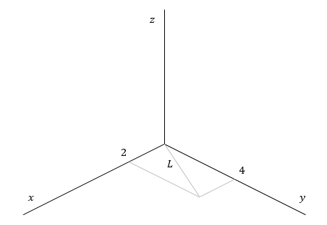 まず、(0, 0, 0) と (2, 4, 0) をつなぐ線 (xy平面上の長方形の対角線) の長さを \(L\) とすると、三平方の定理から