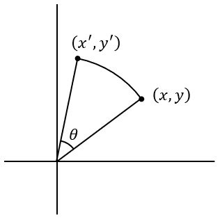 平面上の点 \((x, y)\) を原点を中心に反時計まわりに \(\theta\) 回転させた点を \(x', y'\) とします。これを求めるために、次のような手順で考えます。