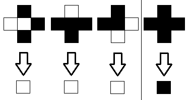 完全な白と黒だけのピクセルからなる画像で、「特定のピクセルの上下左右に隣接するピクセルのすくなくともどれか1つが黒なら、中心のピクセルも黒にする」
