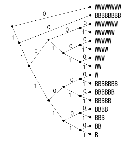 上のケースで「Bがいくつ続いたか」「Wがいくつ続いたか」に応じて、シンボルの並びに対して符号語を作ってみます。