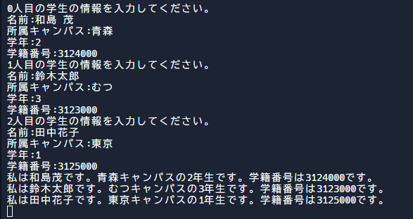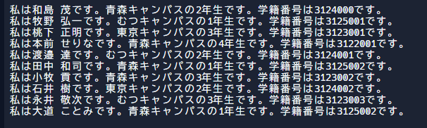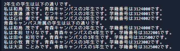 System.out.println("青森キャンパス所属の学生は以下の通りです。");