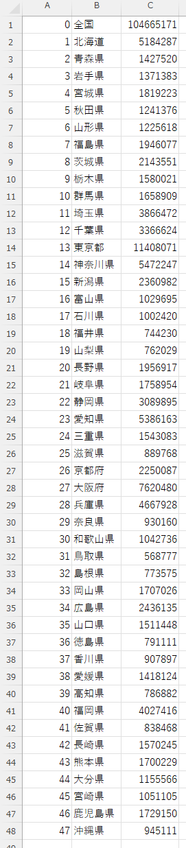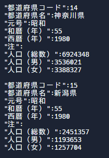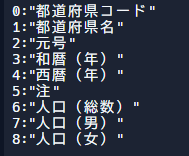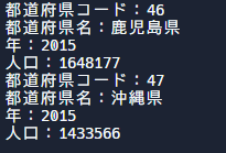 bw.write(data.get(i).prefectureCode + "," + data.get(i).prefectureName + "," + data.get(i).population);