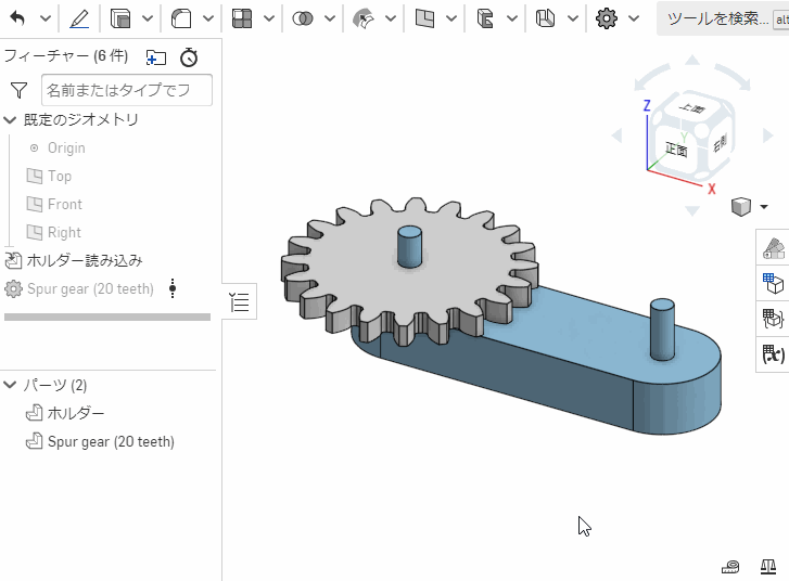 例えばこのようにすれば、ホルダーの左の軸の位置に、中央に2mmの穴があいた Pictch circle (基準の円) の直径が20mm、厚さ2mm、歯が20本の歯車ができる。