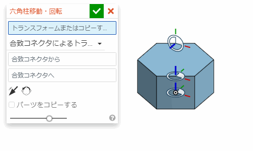 では、「線で平行移動する」「距離で平行移動する」「XYZで平行移動する」「合致コネクタによるトランスフォーム」「回転させる」「その場でコピーする」「スケール」の7通りのことができる。